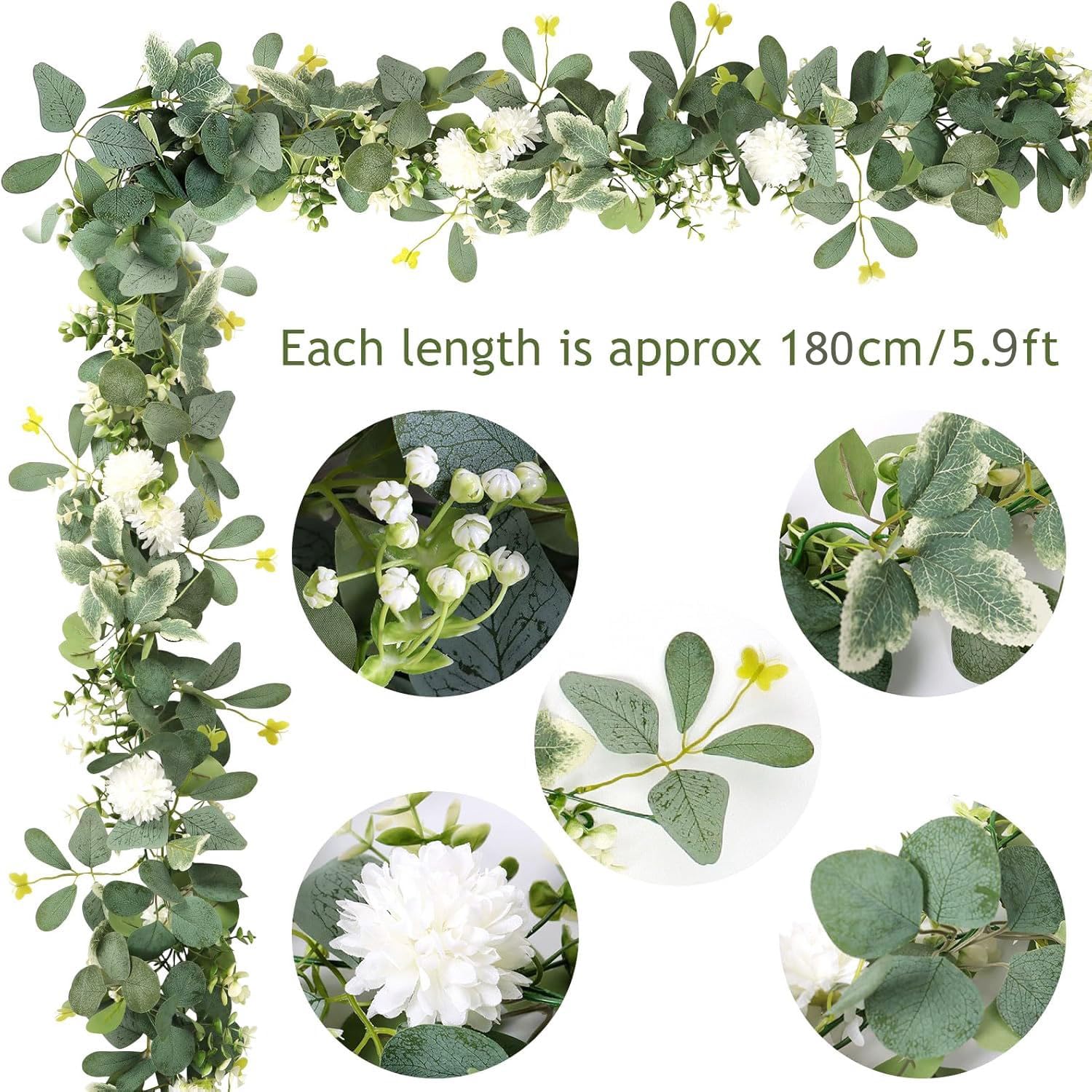 The white chrysanthemum with baby breath flower garland decorate and embellish your life.Details: Color: White Material: Silk flowers heads Size: Length is 5.9ft/180cm. Package: Each package has 2 pcs artificial flowers vine.Warm reminder: 1. Due to manual measurement, please allow 0.39-0.78 inch measurement error. 2. There may be some plastic smell the first time you open the package, just place the flowers vine in a ventilated place to let the smell dissipate will be ok. 3. Clean general surface of Artificial flowers with a hair dryer blowing, or wipe with a rag. Avoiding long-term sunshine has a better effect on maintaining the color of the artificial flowers .