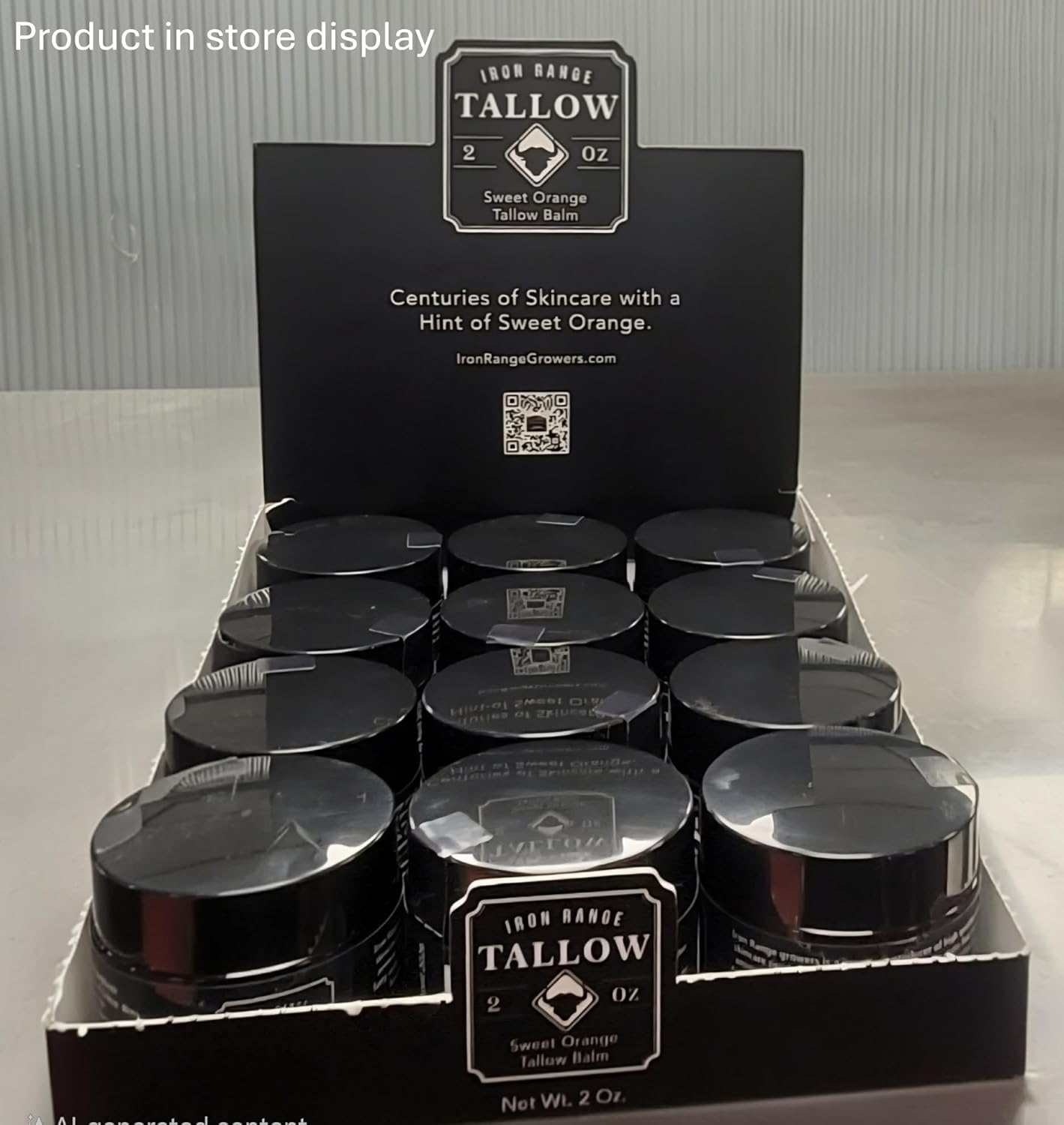 Crafted for hardworking hands and weathered skin, Iron Range Tallow Body Balm delivers unmatched hydration and protection. Inspired by the resilience of the North, this all-natural balm is made with pure, grass-fed tallow, a time-tested moisturizer rich in vitamins A, D, E, and K. Why Tallow? Tallow is nature’s perfect skin food, deeply penetrating and restoring moisture without leaving a greasy residue. Unlike synthetic lotions, it closely mimics your skin’s natural oils, making it highly effective for dry, cracked, and irritated skin. Powerful, Simple Ingredients: Tallow – Packed with essential fatty acids and vitamins to nourish and repair. Shea Butter – Adds extra moisture and locks in hydration. Arrowroot Powder – Provides a silky-smooth, non-greasy finish. Sweet Orange Essential Oil – A refreshing citrus scent with natural uplifting properties.