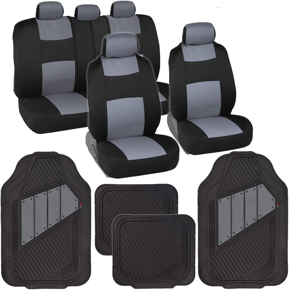 BDK PolyPro Car Seat Covers Full Set with Front & Back 2-Tone Matching Motor-Trend FlexTough Floor Mats:Introducing our universal fit 2-tone car seat covers and rubber automotive floor mats complete set, the perfect blend of style, comfort, and protection for your vehicle. Includes front and back matching seat covers and floor liners offering full coverage for your vehicles interior. Whether you're upgrading the look of your vehicle or providing an extra layer of protection for your seats and car floors, they are the ideal choice.The seat covers & car mats feature stitched accents that enhance your vehicle's interior, giving it a fresh, stylish look. The two-tone color scheme complements any car interior, adding a pop of color while maintaining a sophisticated appearance. Whether you prefer a classic, neutral tone or a bold contrast, these interior protectors will elevate your vehicle’s aesthetic without compromising on functionality.The Universal Fit design ensures that these covers are compatible with a wide range of vehicle models, including trucks, cars, SUVs, and minivans. Designed with adjustable straps and a flexible material, they provide a secure and customized fit. Some slight adjustments may be needed to achieve the perfect look for your specific vehicle.These seat covers are made from high-quality, durable polyester material that offers excellent protection for your seats. They shield against spills, stains, dirt, and wear and tear, keeping your car's interior looking fresh and new.A few examples of make and models these car seat covers and floor mats will fit include: Ford (Explorer, Ranger, Escape, Expedition, Fusion, Mustang), Toyota (Tacoma, Rav4, Highlander, Prius, Camry, Corolla), Chevrolet, Dodge, Honda (Civic, Accord, CRV, Pilot, Odyssey, HR-V), Nissan (Rogue, Altima, Titan), Jeep (Wrangler, Grand-Cherokee), Subaru, Hyundai, BMW, Mercedes, Lexus and more!