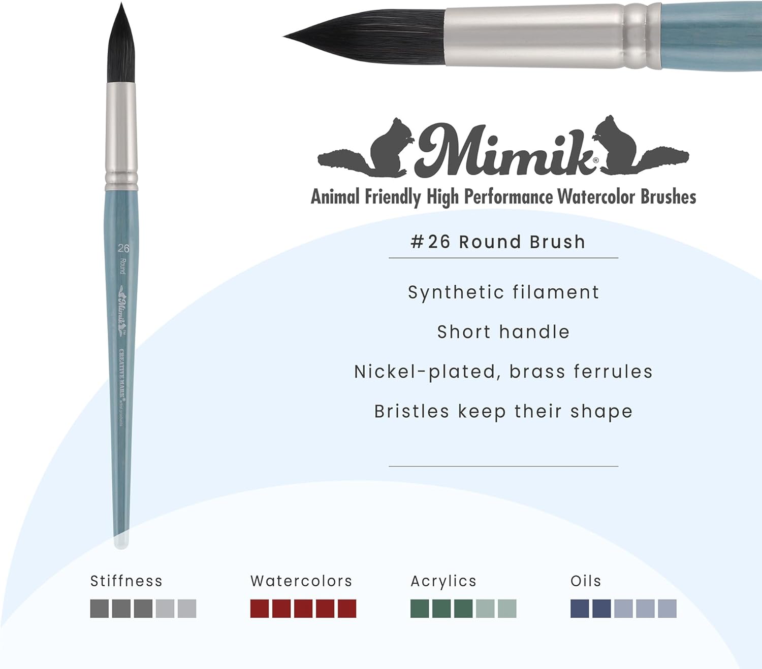 Introducing the Mimik High Performance Synthetic Squirrel Brush, an exceptional addition to your watercolor brushes collection. This refined tool is specifically designed for artists who seek the perfect balance between precision and artistic flair. Mimik's commitment to excellence is evident in every aspect of this watercolor brush, offering unparalleled versatility and performance for professional watercolor techniques. Crafted with animal-friendly synthetic fibers, the Mimik brush mimics the qualities of natural squirrel and Kolinsky sable hair, providing artists with a superb control and high color load. This brush is ideal for watercolor, gouache, and acrylic applications, delivering a sharp paint edge with every stroke. The short blue-grey wooden handles are designed for comfortable use, while the matte nickel-plated brass ferrule ensures durability and stability. The Mimik Squirrel watercolor brush is part of a comprehensive series that includes a variety of popular shapes and sizes such as dagger, fan, flat, oval, rigger, round, script liner, and wash/glaze. This versatile range allows artists to experiment with different techniques and achieve stunning results across diverse mediums. Each brush in the watercolor professional brushes collection offers the benefits of natural hair without any drawbacks, ensuring an exceptional painting experience. These watercolor brushes are perfect for artists seeking a natural feel with synthetic convenience. The synthetic hair watercolor brush design ensures a superb brush response and high color retention, making it one of the best watercolor brushes available. With its synthetic squirrel hair, the Mimik brush provides a professional watercolor brush experience, perfect for both beginners and seasoned artists.
