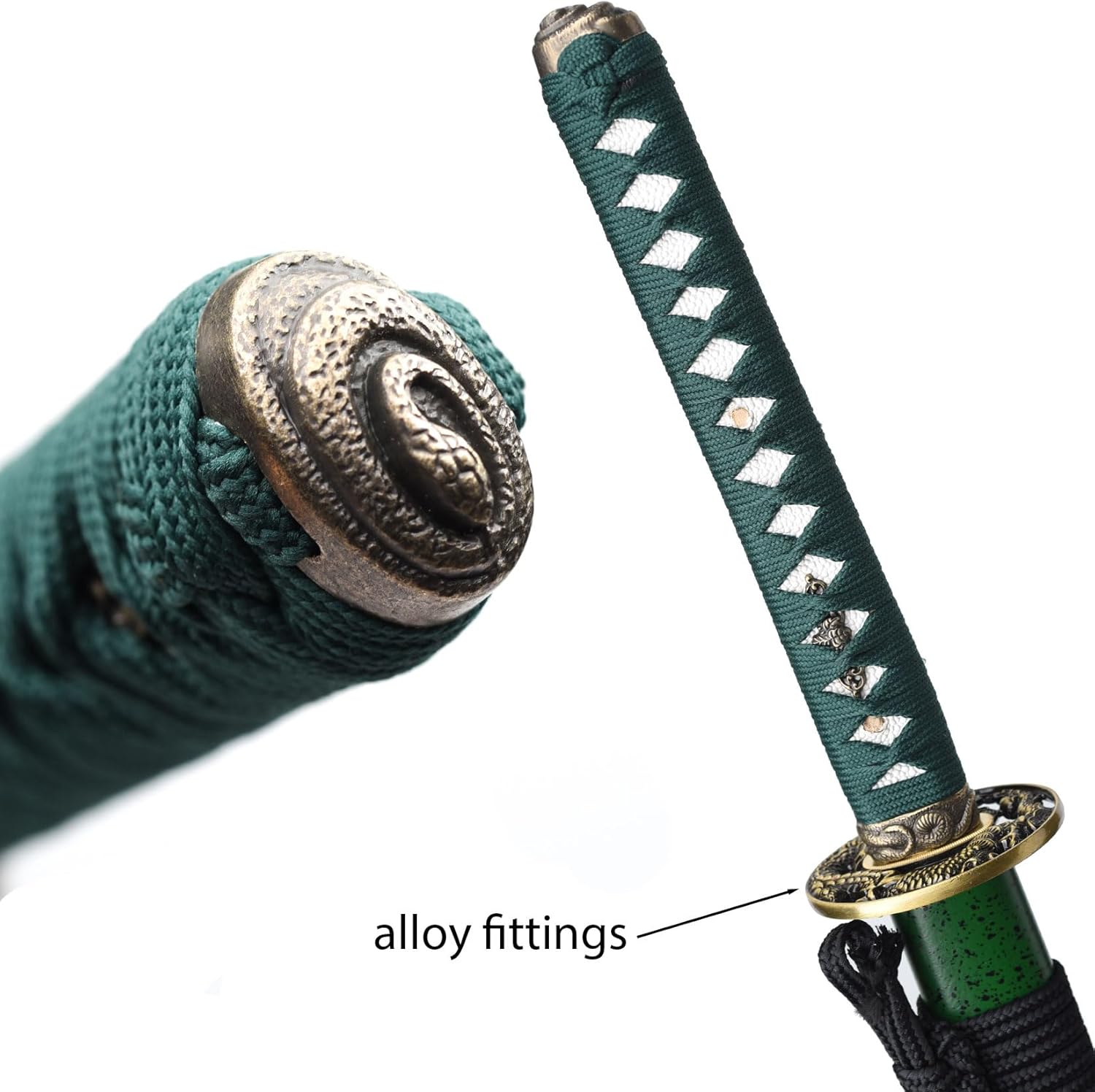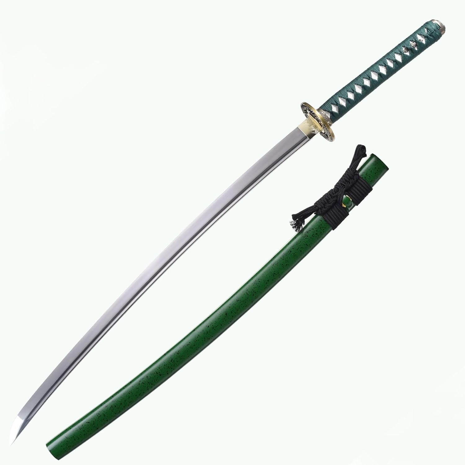 Each blade is handcrafted by skilled smiths! High-carbon steel with visible hamon, alloy dragon tsuba symbolizing heritage, dark green tsuka for perfect grip, and solid wood saya with black speckles—elegance meets edge,Free Gift: Premium black canvas sword bag (dust-proof & scratch-resistant)。