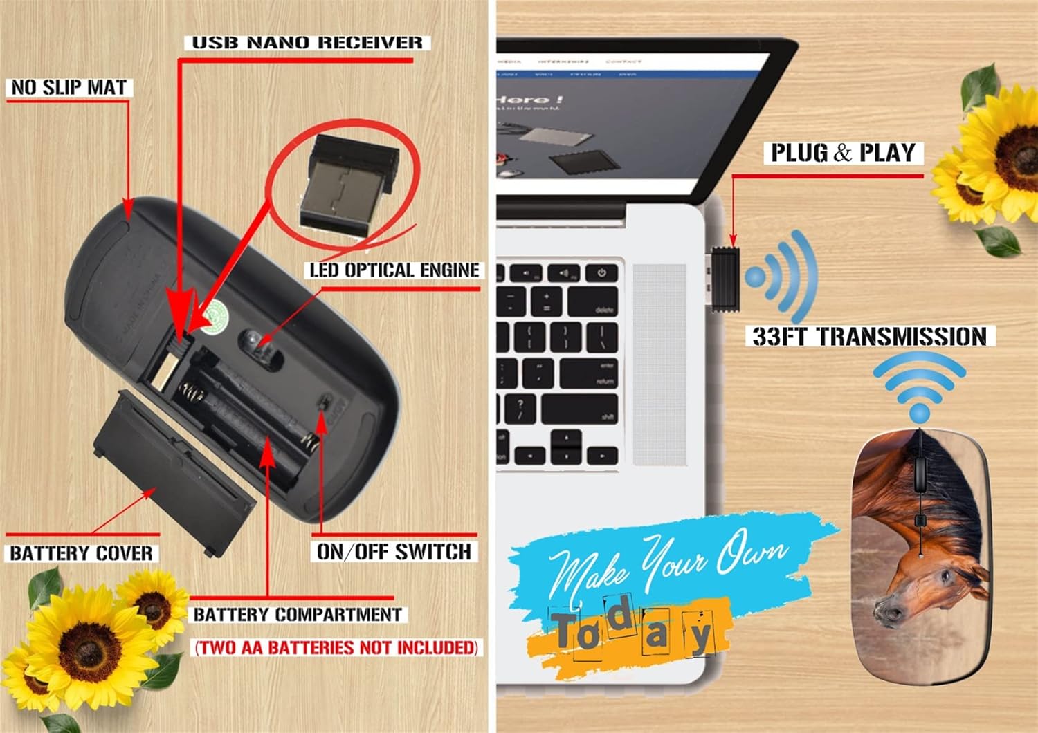 Wireless Mouse White Computer, Mac, ChromebookHow to Use:1. Put in the 2 AAA batteries, take the dongle (usb receiver) out, which is in the battery compartment of the mouse.2. Insert the dongle (usb receiver) into a USB port.3. Turn on the mouse power switch at the back side of the mouse. 4. Allow a few seconds for installing, no action needed, just wait.Technical Details:Wireless technology: 2.4 GHZ, up to 33ft/10mWorking type: OpticalUSB interface: USB 2.0 Power source: 2 AAA Batteries (Not included in package)Warm Tip:After being tested, we found that color might seem a little different (lighter or darker) on different monitors.After-sales Service:1. 30 days warranty by Maizi. Free return or replacement within supported if defective.2. “Your satisfaction is our highest priority”. If you have any problems about this product or your order, please feel free to contact us.Contact Us:Log in Amazon account>find the order>click "Get help with order">choose specific subject>click Ask Seller.