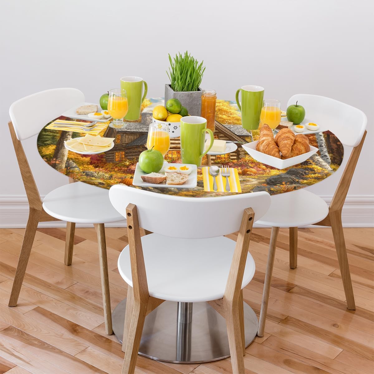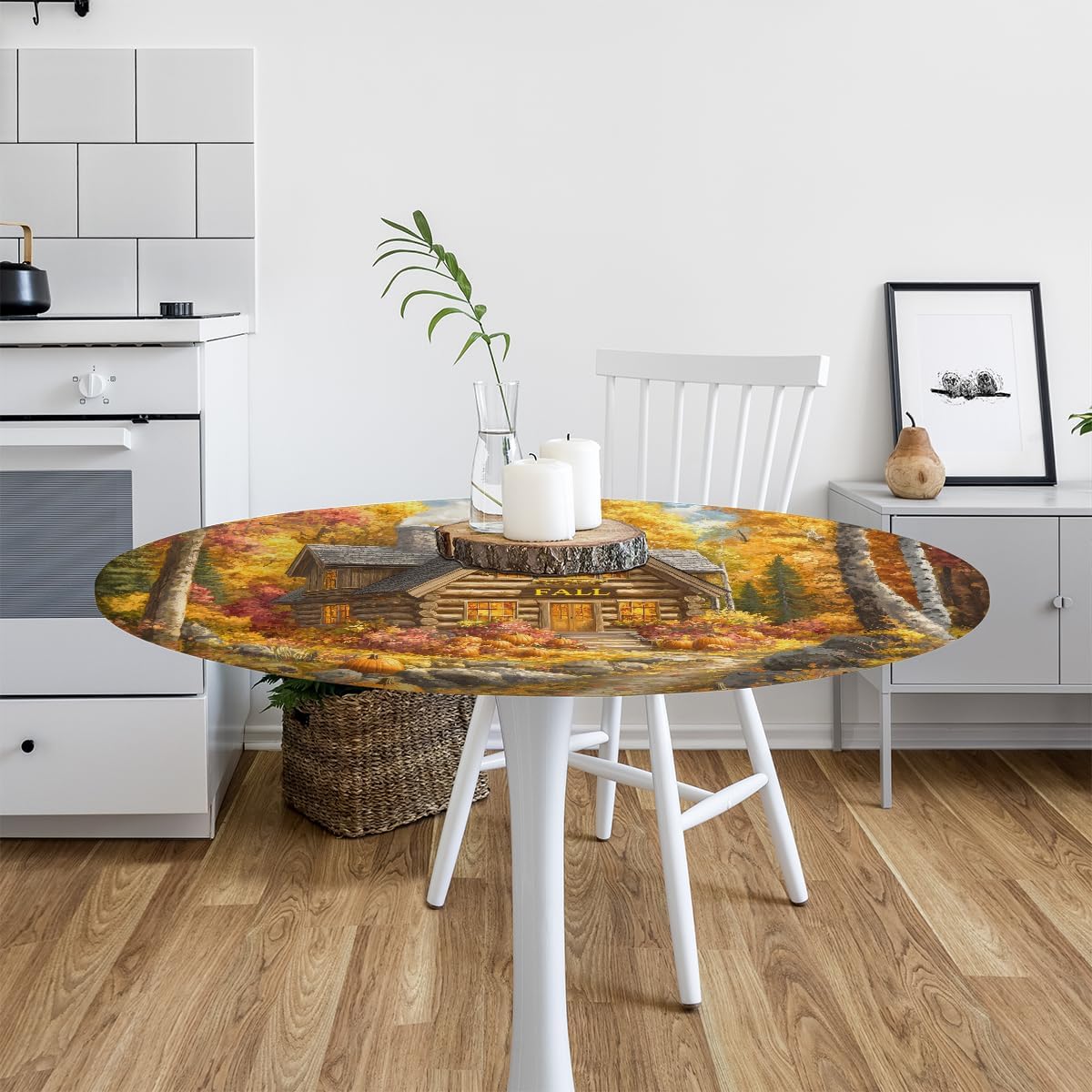 house fall pumpkin round tablecloth with elastic edge small fitted circle table cover wipeable round table cloth for indoor outdoor patio Dining Kitchen decorOur store offers a variety of DIY-themed table covers round designs for you to choose from, including animal, floral, beach, marble, funny, and cute styles.Product Size: Fits 36-42inch or 45-56inch round tables made of wood, glass, or metal.Product Included: 1 fitted round table cloth.Product Features:The elastic edge ensures a secure fit, preventing the house fall pumpkin tablecloths from slipping or sliding.Child-friendly design prevents kids from easily pulling it off.Our circle table cover is made of durable polyester fabric that is fade-resistant and tear-resistant wipeable, waterproof, and oil-proof. Liquids such as drinks, soup, or sauces won't penetrate the surface—just clean with a damp cloth.Machine washable on a delicate cycle with mild detergent. Do not bleach. Iron on low heat from the back if needed.this circle table protector is suitable for dining tables, kitchens, restaurants, buffet dinners, picnics, banquets, coffee tables, weddings, parties, birthdays, cafes, barbecues, camping,patio and both indoor and outdoor use.Gift Idea:This house fall pumpkin fitted tablecloth makes a thoughtful gift for moms, dads, sisters, brothers, grandparents, spouses, children, friends, and all other loved ones. Choose from a variety of fun, stylish, and surprising designs to suit any personality.